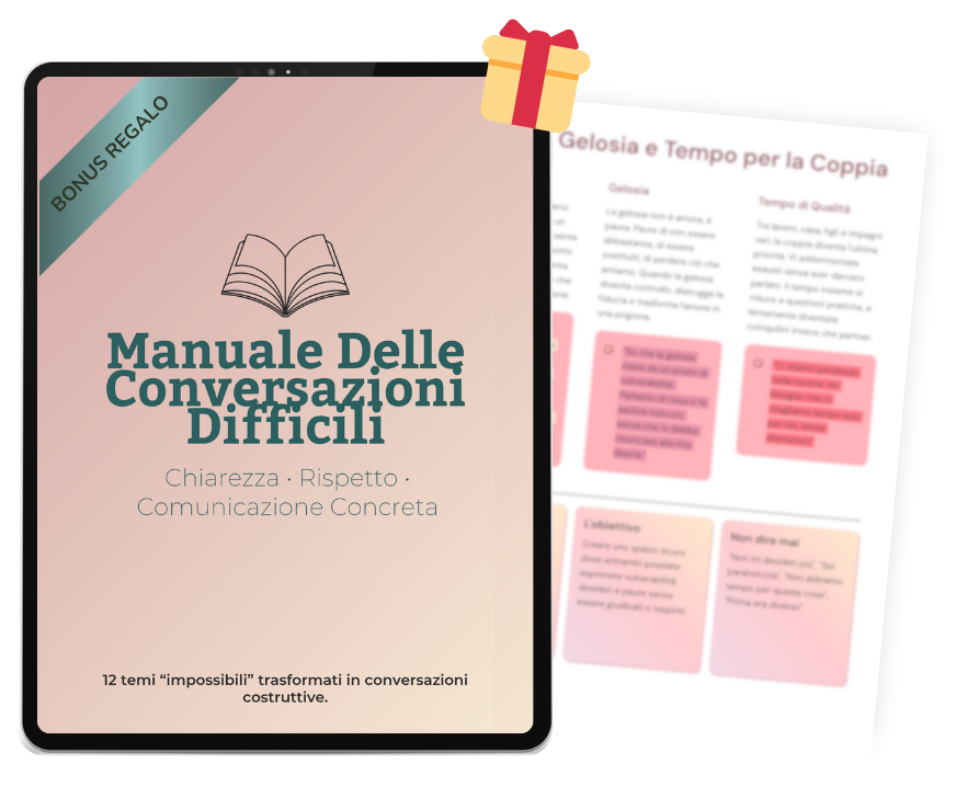 E onestamente? Anche le coppie che FANNO terapia traggono beneficio da questi strumenti. Perché la terapia ti aiuta a capire il "perché", ma non sempre ti dà il "come" pratico per il momento critico.